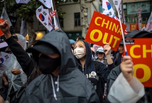 | | 3日、ソウル東大門で開かれた「中国人ノービザ反対デモ」。「CHINA OUT」と書かれたプラカードを掲げ、抗議する参加者 |