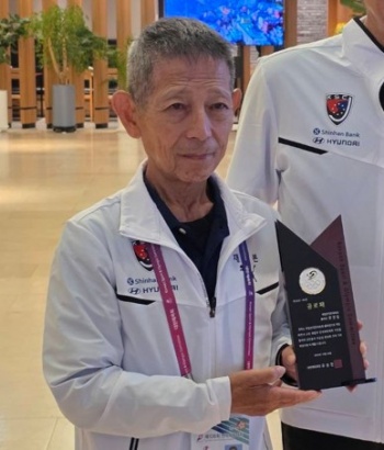 1996年に大会が始まったころから大会の運営に携わっている 文京一・体育会関東本部直前会長は、「第1回を開催した際のスローガンは”がんばれ21世紀の主役たち”だった。小学生の頃に大会に参加した在日同胞たちが成人し、青年会や民団を支える構成員になっていって欲しいという思いから企画をスタートさせた。在日同胞子弟の減少という課題を抱えながらも、これまで一度も途絶えさせずに大会を継続でき、来年には30回となる節目を迎えようとしている。この大会の運営に関わる全ての関係者に感謝している」と述べた。なお、文直前会長は長年の体育会への貢献により釜山国体の開催中の先月20日、大韓体育会(柳承敏会長)から功労杯を受けている=写真=。