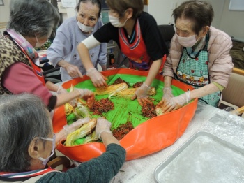 テーブル3つが用意され、入所の高齢者がそれぞれ取り囲み、刻み大根やニラをヤンニョムに混ぜ込み、最後に塩漬けの白菜に練り込むという作業だった。作業中に、途中で食べない、持ち帰りはなし、ゆっくりやるという3点が注意され笑いを誘うなか、和気あいあいとキムジャンが進行した。(大阪=韓登)