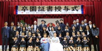 認定こども園「建国幼稚園」(金秀子園長)は14日、「第46期生卒園証書授与式」を行った。最年長クラスであるケナリ班(5歳児)の園児らの卒園を祝った。