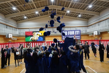 (上)大阪金剛インターナショナル中学校卒業生による帽子投げ
