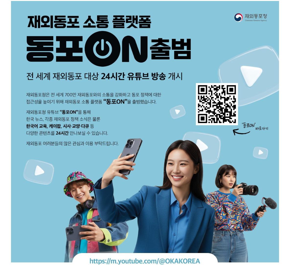 재외동포청(청장 김경협)이 자체 유튜브 채널인 ‘동포ON’을 개편, 7일부터 재외동포가 정책을 직접 묻고 정부가 실시간으로 답하는 ‘참여형 정책 소통 플랫폼’으로 운영한다고 밝혔다.