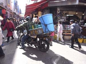 市場の狭い路地でバイクを走らせる配達のアジョシ