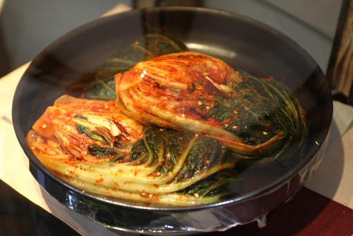 作りたての爽やかさはもちろんだが、短時間のうちに甘味・塩気・辛味・酸味・鹹さの五味が伝わってきた。まろやかな酸味と辛さが何ともさっぱりとしている。「薬念は今、入れたもので全部ですか」と聞くと「そう。薬念はキムチの種類によっても使う量も違ってね。今日はカタクチイワシの汁を入れたけど塩辛を使うこともあるし。塩辛の種類もいろいろあるから、作る人によるね。自分で作ってみることだね」と笑いながら「日本に帰っても韓国産のキムチを食べてね。キムチは発酵していないとダメだから」と。女将さんは、売り物の白菜のキムチやキュウリのキムチなどを皿に出してくれた。箸が止まらない。アッという間に皿はカラになっていた。
