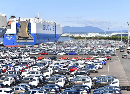| | | 現代自動車蔚山工場の埠頭で船を待つ輸出用自動車