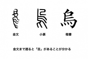 ところが、甲骨文や金文にまで遡れば「鳥」と「烏」の字形の違いは一目瞭然となる。図の金文を見て欲しい。その時代には目がはっきりと描かれているのが理解できるだろう。「烏」の字は「鳥」から派生したものではないのだ。