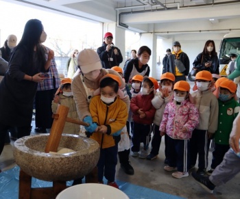 園児は、「お餅つきは、人の絆と協力の精神を象徴し、神様から力を分けてもらい、新しい命や力を授かると言われている。今日のお餅つきの経験から、新たな力につながっていってくれることを願う」などという先生の話に熱心に耳を傾けていた。(大阪=韓登)