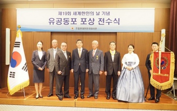 駐日本国大韓民国大使館(李赫特命全権大使)は11月27日、同館ホールで「第19回世界韓人の日記念有功同胞褒章伝授式」を開催、関係者約50人が集まった。在日同胞社会の発展、韓日友好親善に貢献した個人及び団体に対し、韓国政府から勲章と表彰状が授与された。