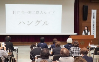 ソウル出身で、駐日韓国文化院(朴英恵院長)や東京韓国教育院(金奎卓院長)などで韓国語講師を務める禹兪美さんが登壇、「世界唯一無二偉大な文字ハングル」と題し講演を行った。