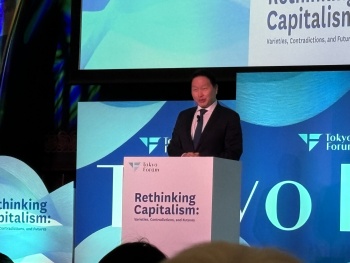 | | | 「TOKYOフォーラム2025」であいさつする崔泰源会長=昨年11月21日、東京大学安田講堂 |