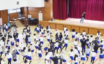 (下)13日、佃島小学校体育館で約500人が集まったK-POPダンス教室。東京韓国教育院スタッフの西野夏葵さんが講師を務めた