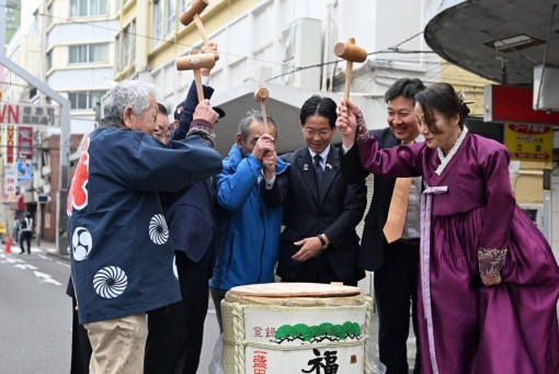 開幕式では主催の両代表や大使館関係者らが挨拶を述べ、樽酒の鏡開きで開幕。会場には鮮やかな韓服姿の韓人会スタッフたちや、濃紺の法被姿の町内会関係者が入り混じり、演壇では日本の獅子舞や韓国のプンバの演舞、サックス演奏などが行われ、その前で随時、餅つきが実施された。この行事では料理が無料で提供され、韓人会側からはトッククやマッコリ、町内会側からは豚汁が無料で振る舞われ、お昼時には参加者が道を埋め尽くすほどの盛況ぶりだった。会場では子どもたちによるテコンドー演武や、供え物が並ぶ祭祀膳が設けられ、福富町でのコリアンの存在感を示した。
