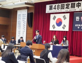 在日本大韓民国青年会中央本部(李将浩会長)は都内の韓国中央会館で22日、「第48回定期中央大会」を開催、代議員50人(定員83人)が出席、成立した。3連休の中日にあたる開催であったにもかかわらず、民団中央本部の金利中団長、同金春植監察委員長、一般社団法人在日韓国商工会議所の朴秀幸副会長、洪政國・在日韓国科学技術者協会会長、金奎卓・東京韓国教育院院長ら10人の来賓が参席、次世代を担う青年会中央本部の新たな船出に対しエールを贈った。同会で第21・22期会長を務めた鄭昇栄さんは、「中央大会での決議事項は青年会の総意となり、ハードルが高く発言しづらいかもしれないが、中央執行部は会員の皆さまの意見を何より必要としている。ぜひ一人でも多く発言できる機会になって欲しい」と激励辞を述べた。