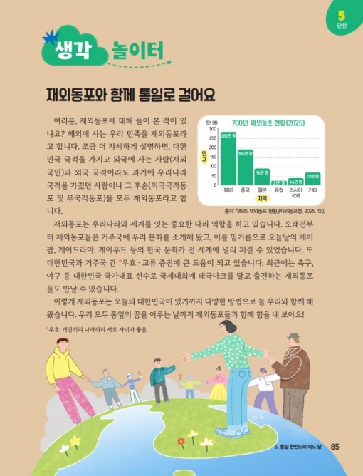 掲載されたのは、小学6年生向けの道徳教科書「統一された韓半島のある日」という単元(85ページ)=写真。「在外同胞とともに統一へ歩もう」というページでは、在外同胞の概念と現状、在外同胞が祖国と世界を結ぶ架け橋として居住国との交流・協力に貢献してきた役割が紹介されている。